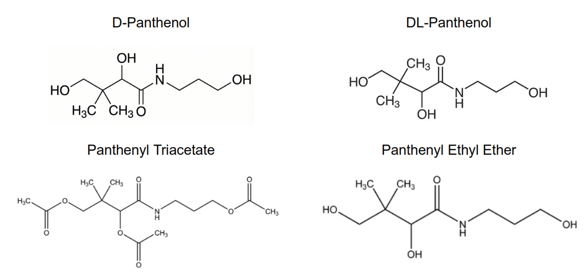 Vitamin B5 (pantothenic acid) is a water-soluble B vitamin that plays a role in various biological processes, including cellular metabolism and lipid synthesis. In skincare, several derivatives of pantothenic acid are commonly used, such as D-Panthenol, DL-Panthenol, Panthenyl Triacetate, and Panthenyl Ethyl Ether. Vitamin B5 derivatives are more widely used in skincare because panthenol penetrates the skin more readily and remains present more stably than vitamin B5 itself. Vitamin B5 in its natural form (pantothenic acid) has difficulty penetrating the skin due to its high polarity.