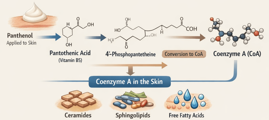 Once applied to the skin, panthenol is converted to pantothenic acid via oxidation within the skin. Subsequently, pantothenic acid undergoes phosphorylation to 4′-phosphopantetheine, which is then converted into its active form, coenzyme A (CoA).