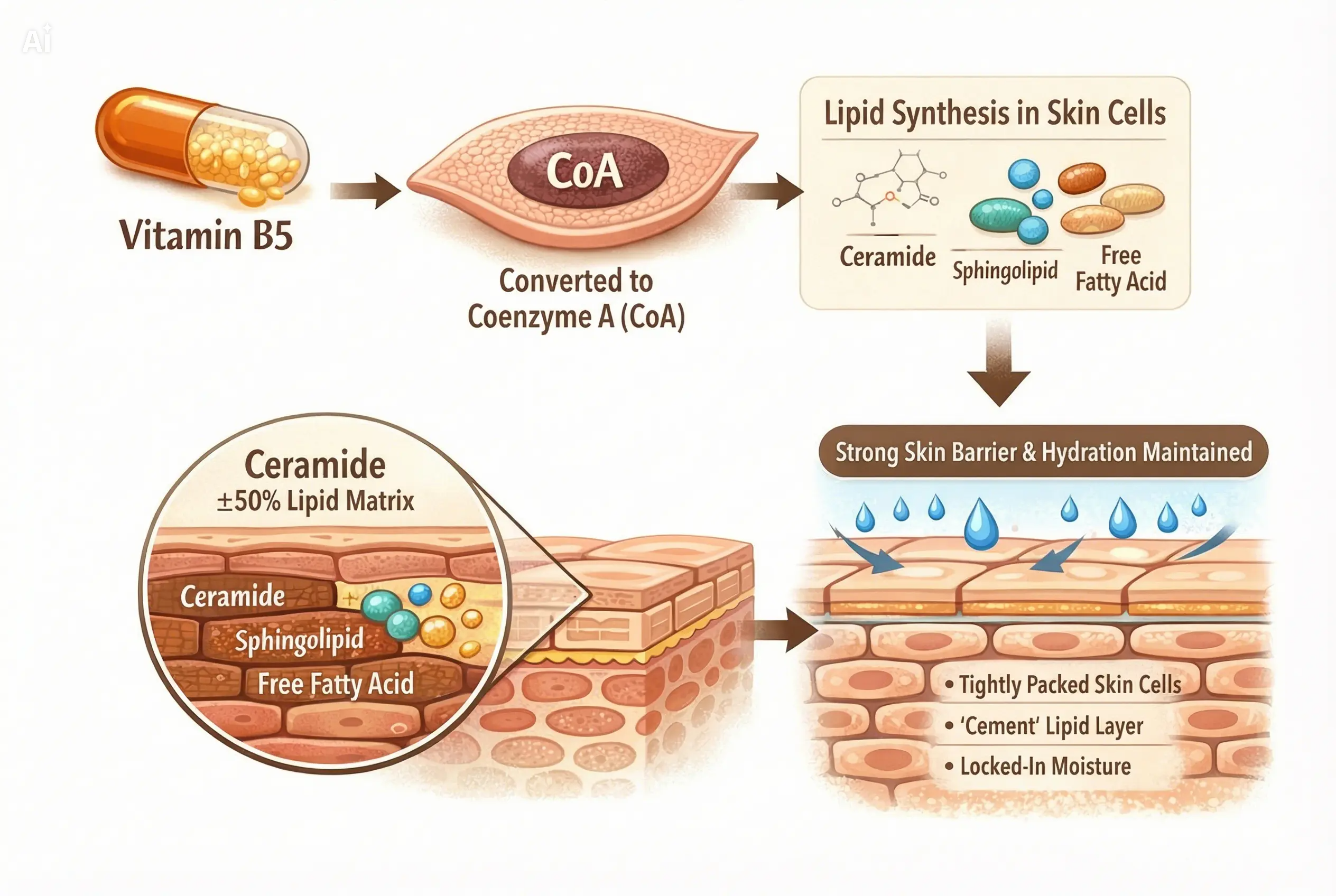 Research shows that vitamin B5 (pantothenic acid) and its derivatives, such as panthenol, act through several interrelated biological mechanisms to maintain hydration and strengthen the skin barrier.