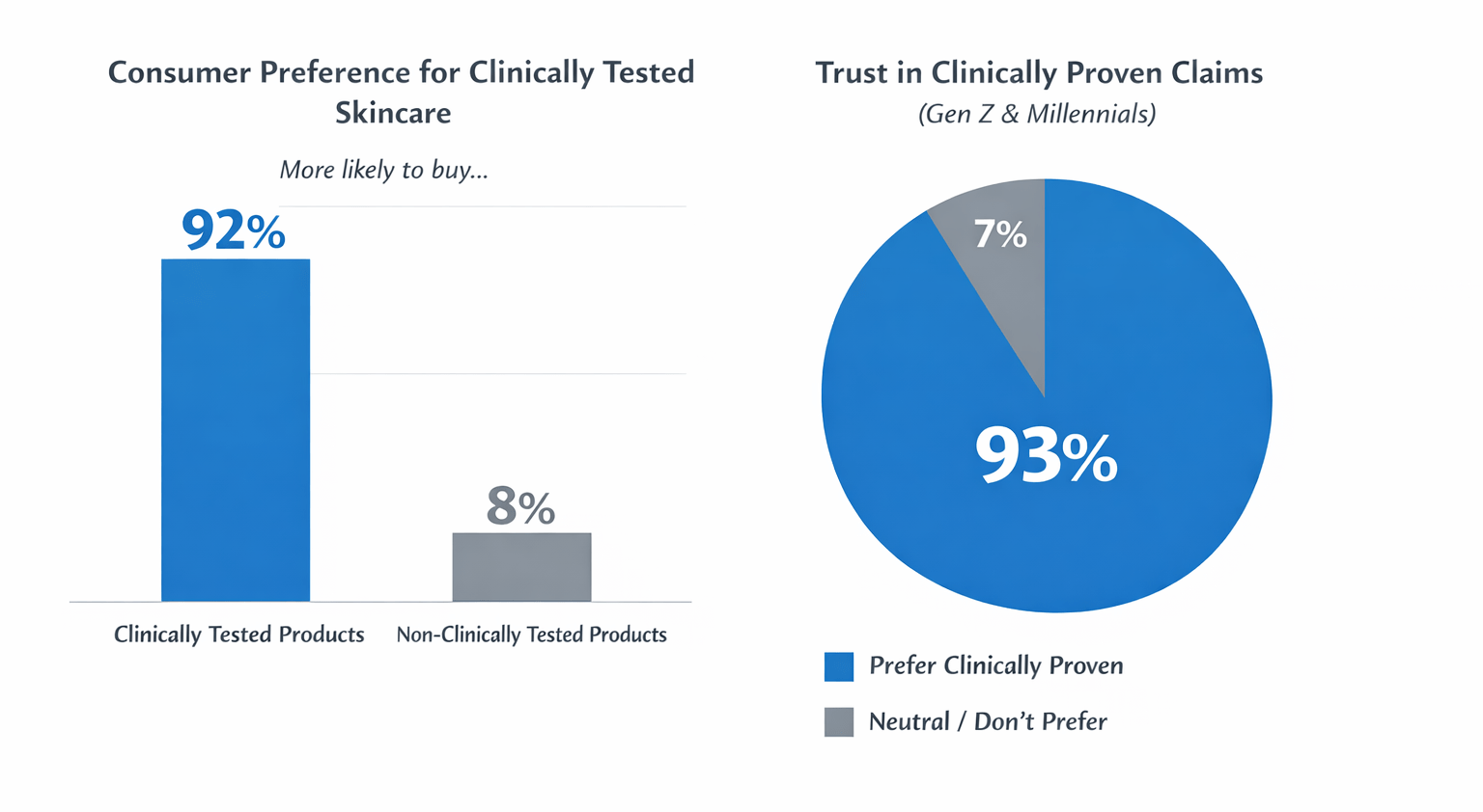 In the competitive skincare industry, consumers are increasingly selective in their product choices. A survey of 1,000 consumers by Citruslabs found that 92% preferred products that had been clinically tested. Among generational groups, Citruslabs found that 91% of Gen Z consumers trust product claims supported by research. This demonstrates that consumer trust and purchasing decisions are not based solely on advertising claims but require concrete evidence.